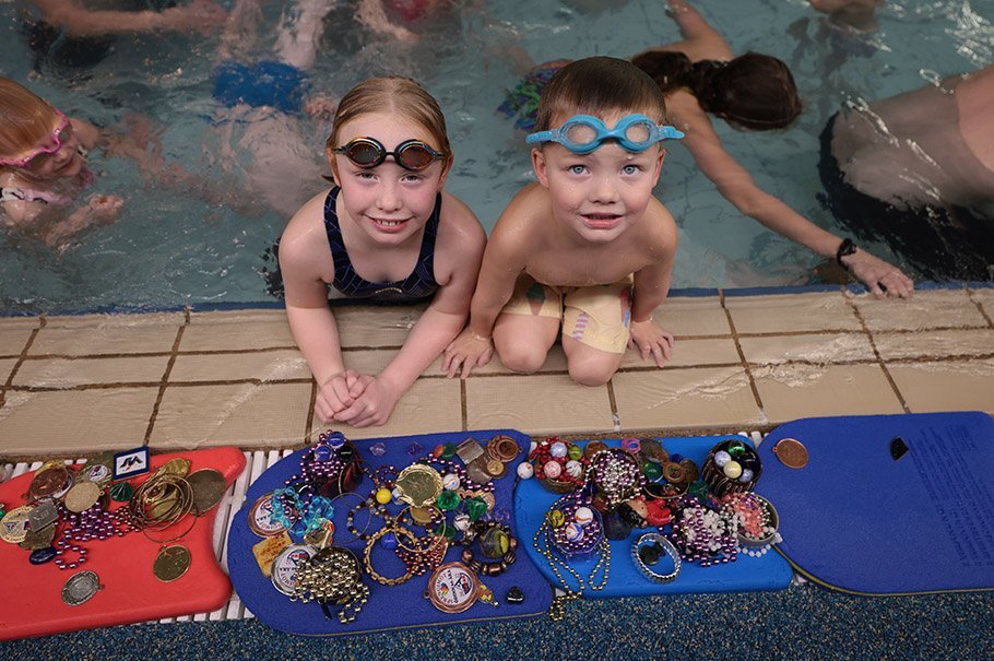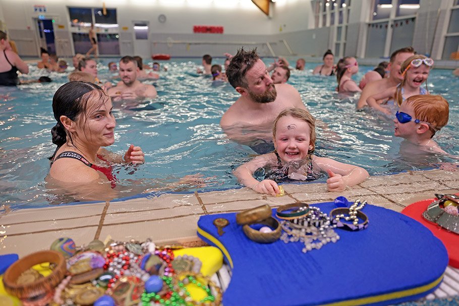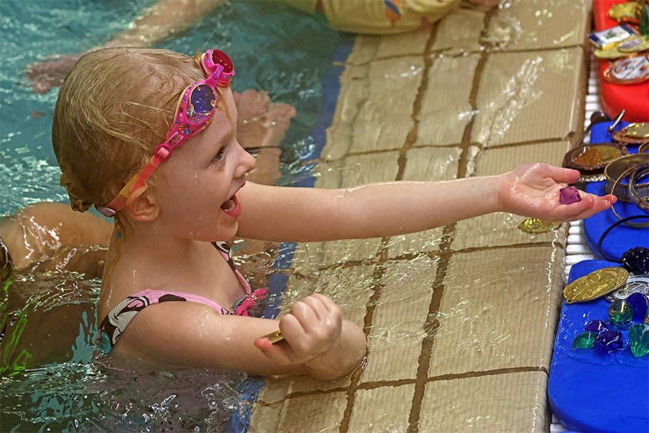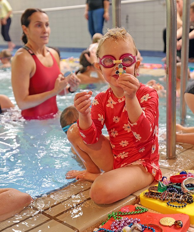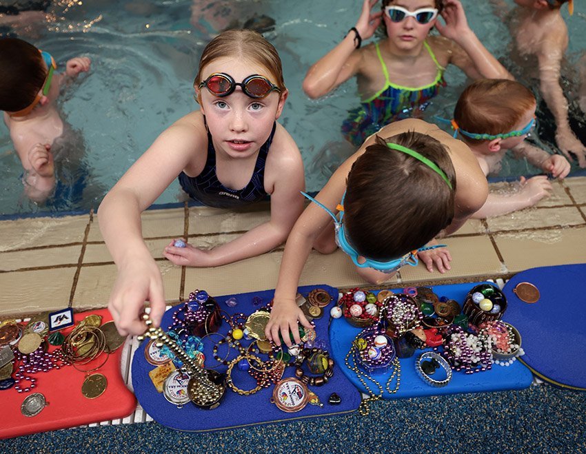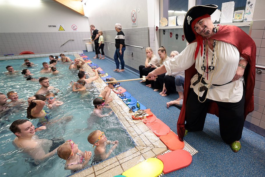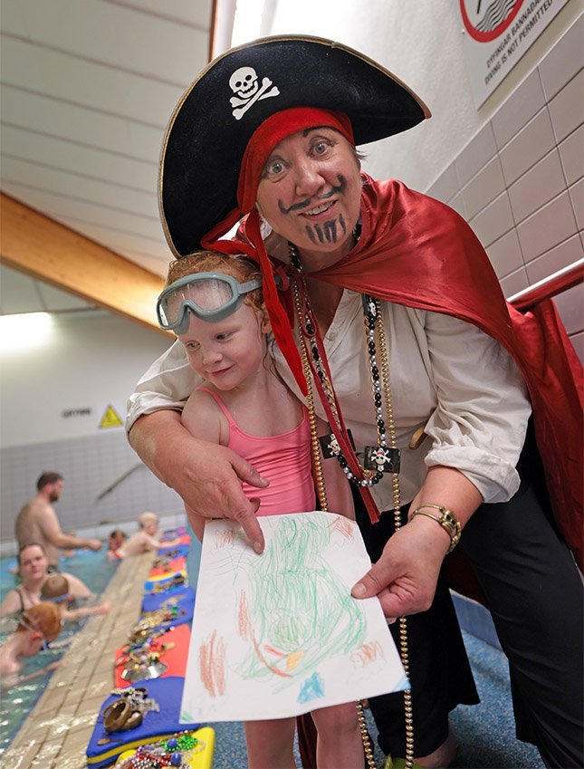 Kafað var eftir gulli og gersemum í Glerárlaug fyrir fáeinum dögum – með mjög góðum árangri! Þar voru á ferð nemendur sundskóla Óðins á árlegum sjóræningjadegi, líklega vinsælasta degi skólaársins; Dýrleif Skjóldal sem stjórnað hefur skólanum í tæpa þrjá áratugi klæddi sig upp á í tilefni dagsins og ekki var annað að sjá en allir skemmtu sér konunglega. Myndir: Skapti Hallgrímsson