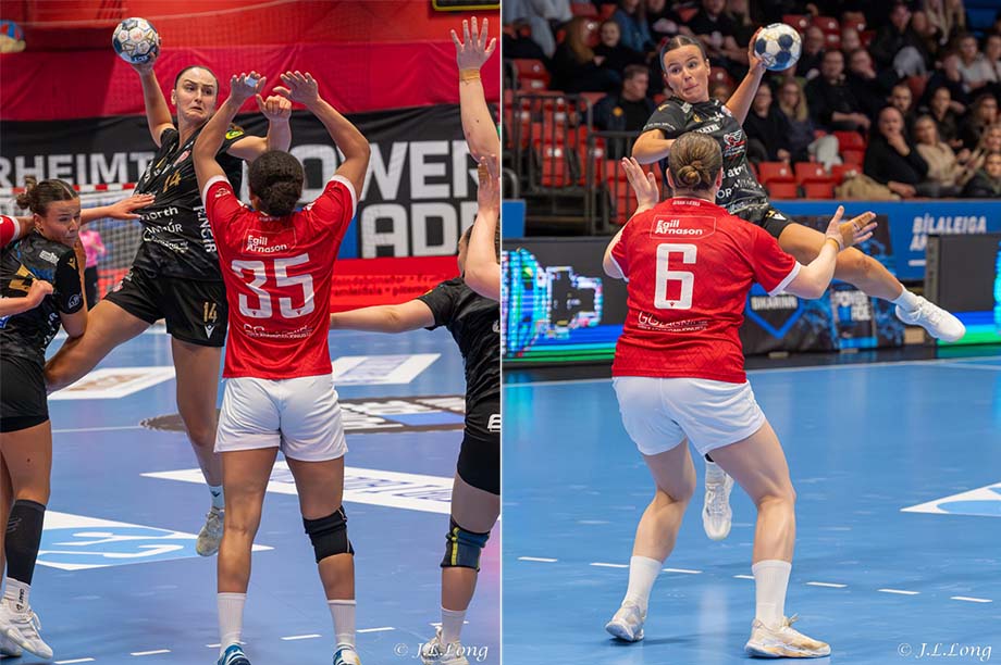 Susanne Denise Pettersen, til vinstri, og Tinna Valgerður Gísladóttir skjóta að Valsmarkinu í leiknum. Myndir: J.L. Long