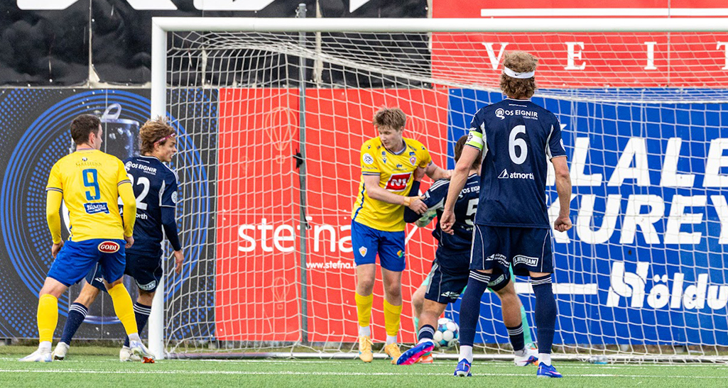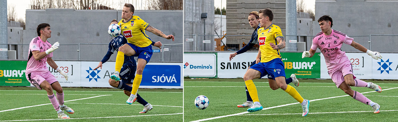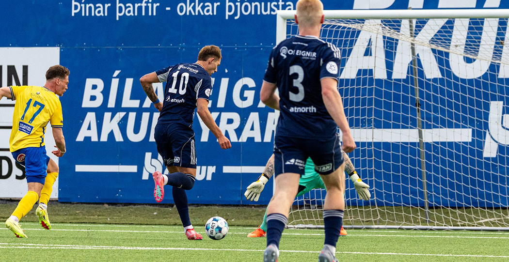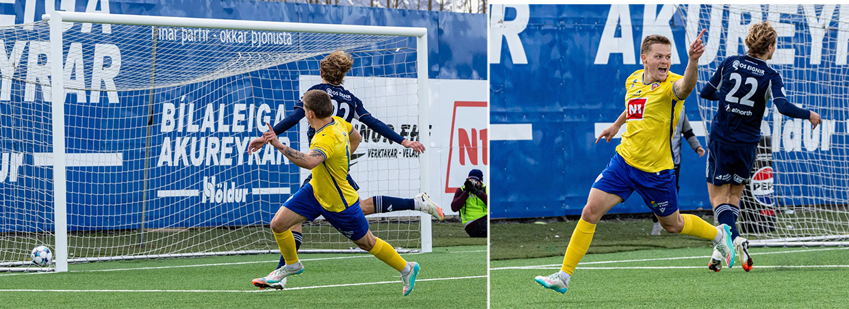 Mark Olivers Heiðarssonar í dag – það fyrsta sem hann gerir fyrir KA. Markinu er lýst hér að neðan. Myndir: Ármann Hinrik