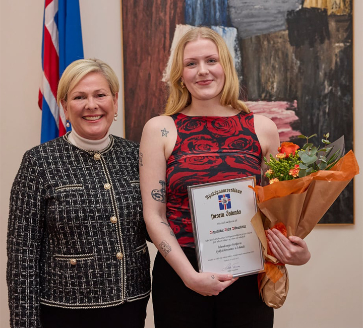 Halla Tómasdóttir, forseti Íslands, og Ragnhildur Björt Björnsdóttir þegar verkefni Ragnhildar var tilnefnt til verðlauna nýsköpunarsjóðs námsmanna á síðasta ári og hlaut var sérstaka viðurkenningu.
