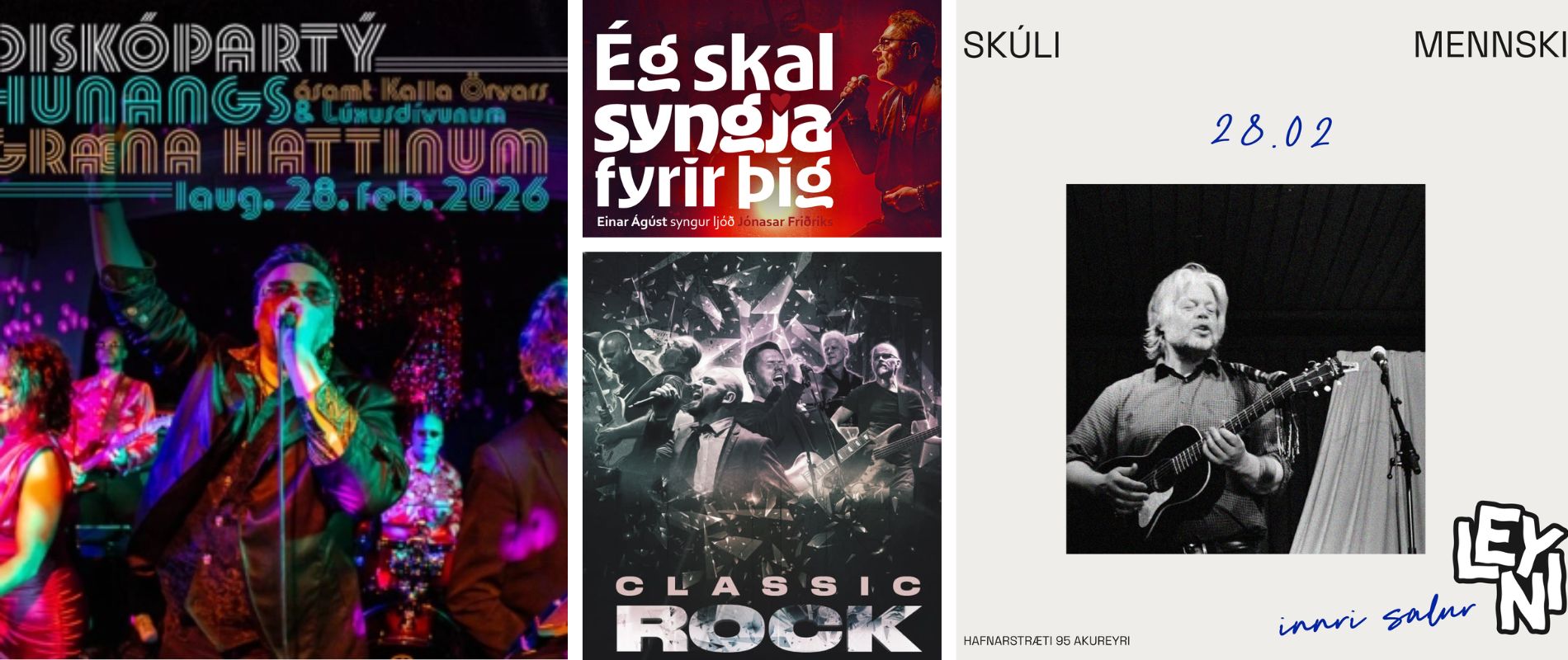 Fjölbreytt tónleikaúrval er í vikunni. Klassískt rokk með Magna og Matta / Hunang og Kalli Örvars á Græna, Einar Ágúst í Hofi og Skúli Mennski á Leyni.