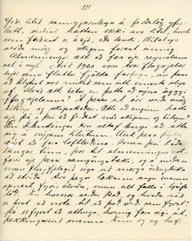 Ég hefi líka lesið að fjárhagur Flugfjelagsins sje slæmur, en af hvaða orsökum kemur hann nema af skilningsleysi á gagnsemi flugferðanna, eða þekkingarleysi. Mörgum fynst svo voðalegt að lyftast frá jörðinni, mest vegna slysahættunnar sem því á að fylgja. Ef allir þyrðu að ferðast loftleiðis myndi Flugfjelagið ekki verða í neinni fjárþröng. Yrði litið sanngjarnlega á ferðalög yfirleitt, virtist hættan ekki svo lítil, hvort sem ferðast er á sjó, eða landi. Bílslys verða mörg og skipin farast einnig.