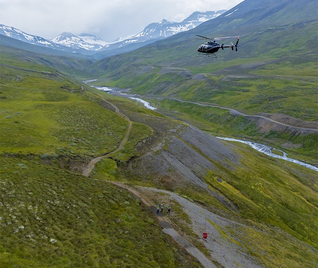 Mynd af vef Akureyrarbæjar frá því í ágúst. Hér sést þyrla sem reglulega flytur efni til stígagerðarinnar inn á dal. Mynd: akureyri.is.