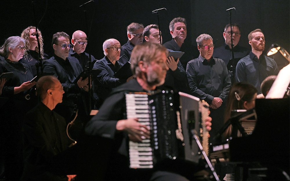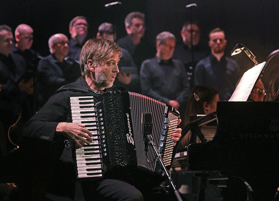 Atli „klæddi sig í nikkuna,“ eins og hann tók til orða, um stund á tónleikunum. Sönghópur SinfóníaNord í baksýn.