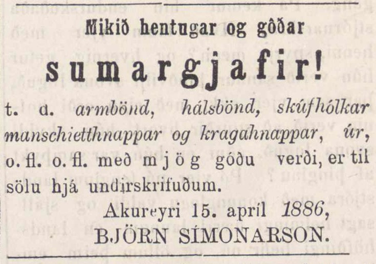 15. apríl 1886 auglýsti Björn Símonarson gull- og úrsmiður á Akureyri í Fróða ýmsa smíðagripi sem þóttu henta vel til sumargjafa. Mun þetta vera ein elsta auglýsing frá Akureyri þar sem auglýstar eru til sölu sérstakar sumargjafir.