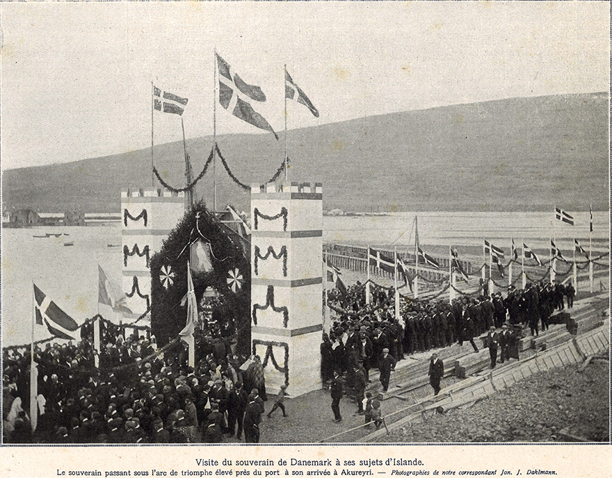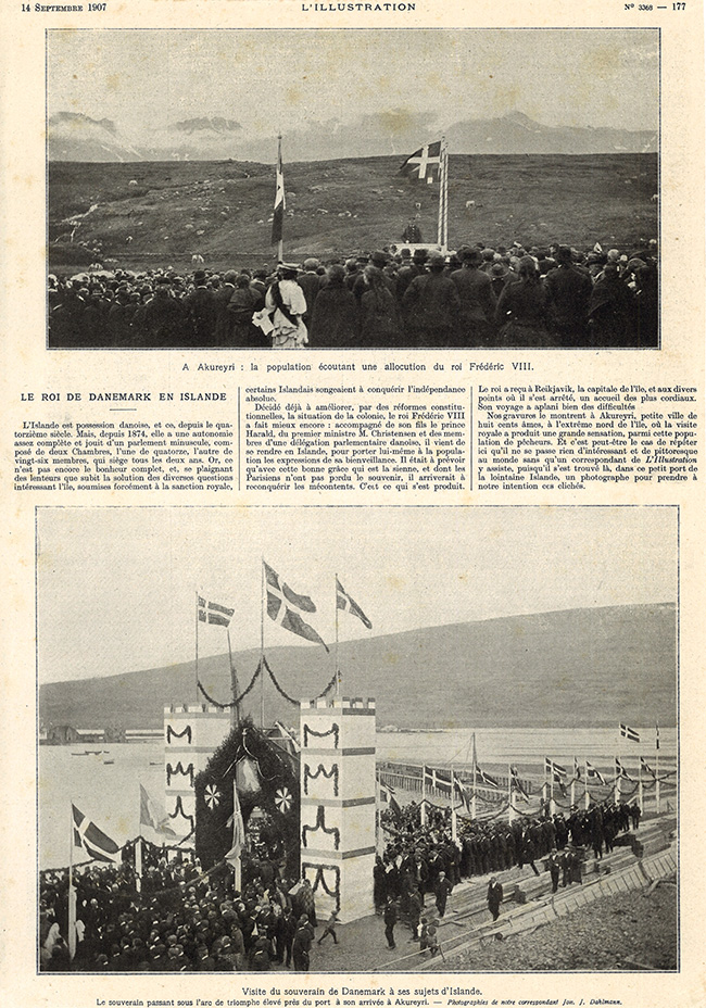 Örk úr franska tímaritinu L'Illustration frá 14. september 1907. Umfjöllunarefnið er koma Friðriks VIII til Akureyrar 13. ágúst sama ár ásamt tveimur ljósmyndum Jóns J. Dahlmanns ljósmyndara á Akureyri.