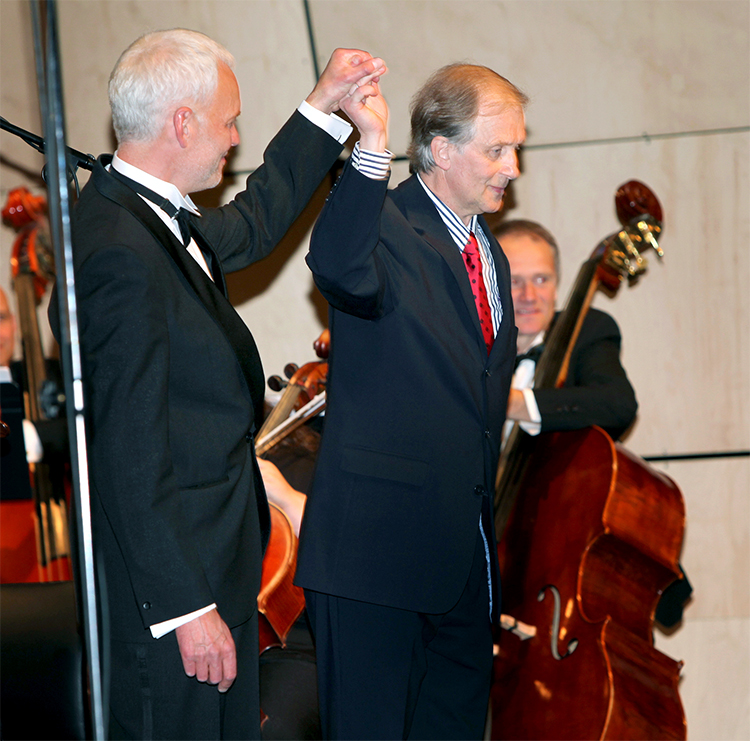 Guðmundur Óli Gunnarsson og Hafliði Hallgrímsson eftir frumflutning verksins Hymnos op. 45 við vígslu Hofs 28. ágúst árið 2020. Mynd: Skapti Hallgrímsson
