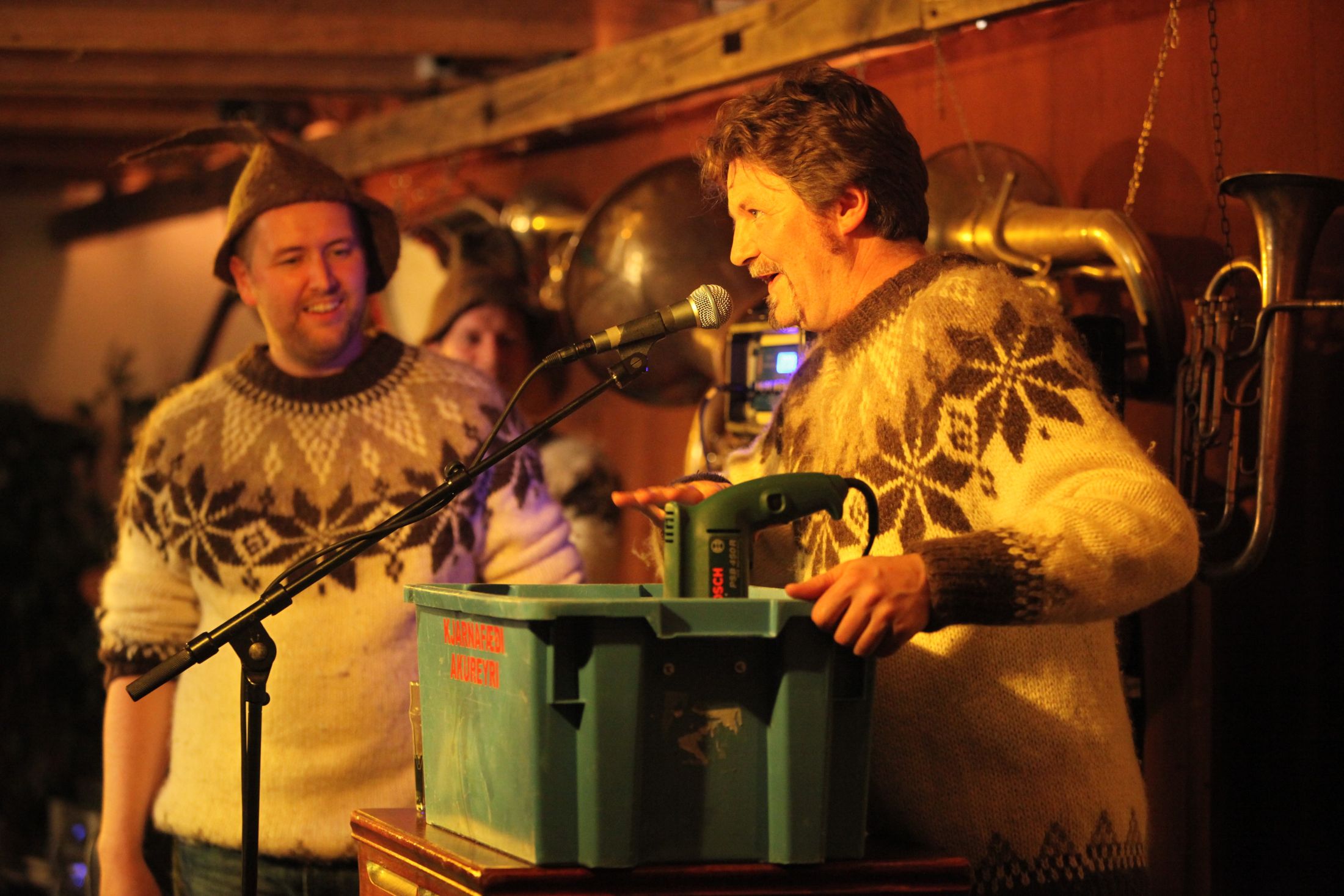 - „Þeir fóru á kostum á tónleikunum. Rögnvaldur með uppistand á milli laga og svo voru dregnir út happdrættisvinningar og boðið upp á föndurhorn. Rögnvaldur sýndi m.a. hvernig hægt er að búa til fótanuddtæki fyrir 265 krónur!“ sagði í Morgunblaðinu. Á myndinni að neðan er Rögnvaldur einmitt að föndra fótanuddtæki.