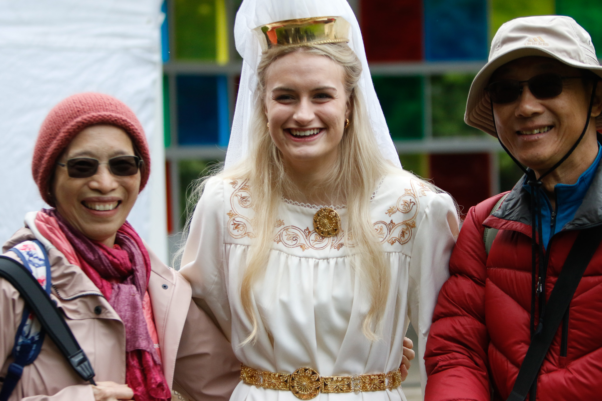 Fáir voru lukkulegri en þessir túristar, sem römbuðu á menningarleg hátíðarhöld innfæddra á þjóðhátíðardaginn! Þau skemmtu sér manna best og báðu um mynd með fjallkonunni. Það var auðsótt!