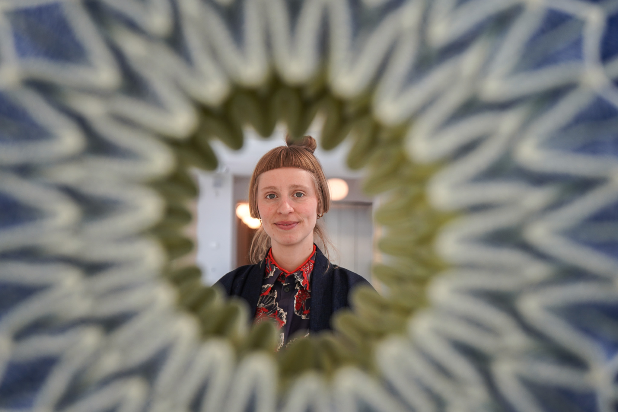 Danska textíllistakonan Emilie Palle Holm sýndi listaverk sín á Listasafninu í ár. Hér myndast hún í gegn um eitt verka sinna.