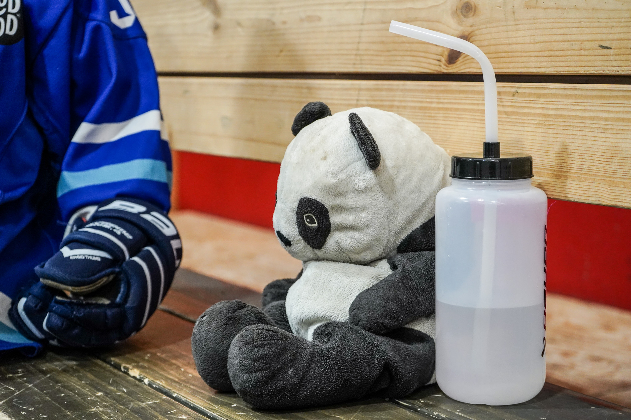 Það er gaman að reyna að koma auga á eitthvað sem lýsir viðfangsefninu á óvenjulegan hátt. Krakkamótið í íshokkí kristallast skemmtilega í íshokkíbrúsa og lukkudýri SR, ansi lúinni pöndu sem hefur sennilega komið með í ófáar skautahallir.