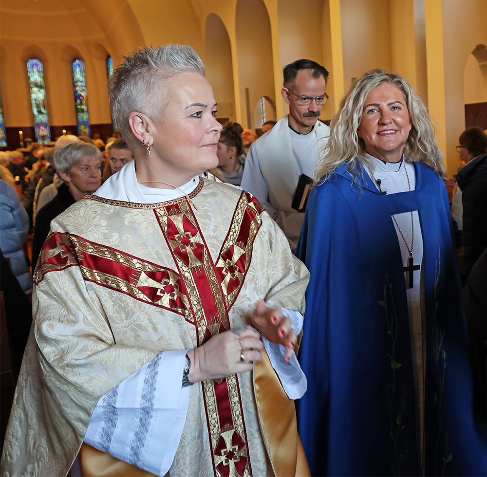 Bekkurinn var þétt setinn í Akureyrarkirkju sunnudaginn 16. nóvember þegar fram fór hátíðarmessa í tilefni 85 ára afmælis kirkjunnar sem var daginn eftir; hún var vígð sunnudaginn 17. nóvember árið 1940. Biskup Íslands, Guðrún Karls Helgudóttir prédikaði og gengur hér úr kirkju, til hægri, ásamt Hildi Eir Bolladóttur sóknarpresti. Á milli þeirra er sr. Aðalsteinn Þorvaldsson.