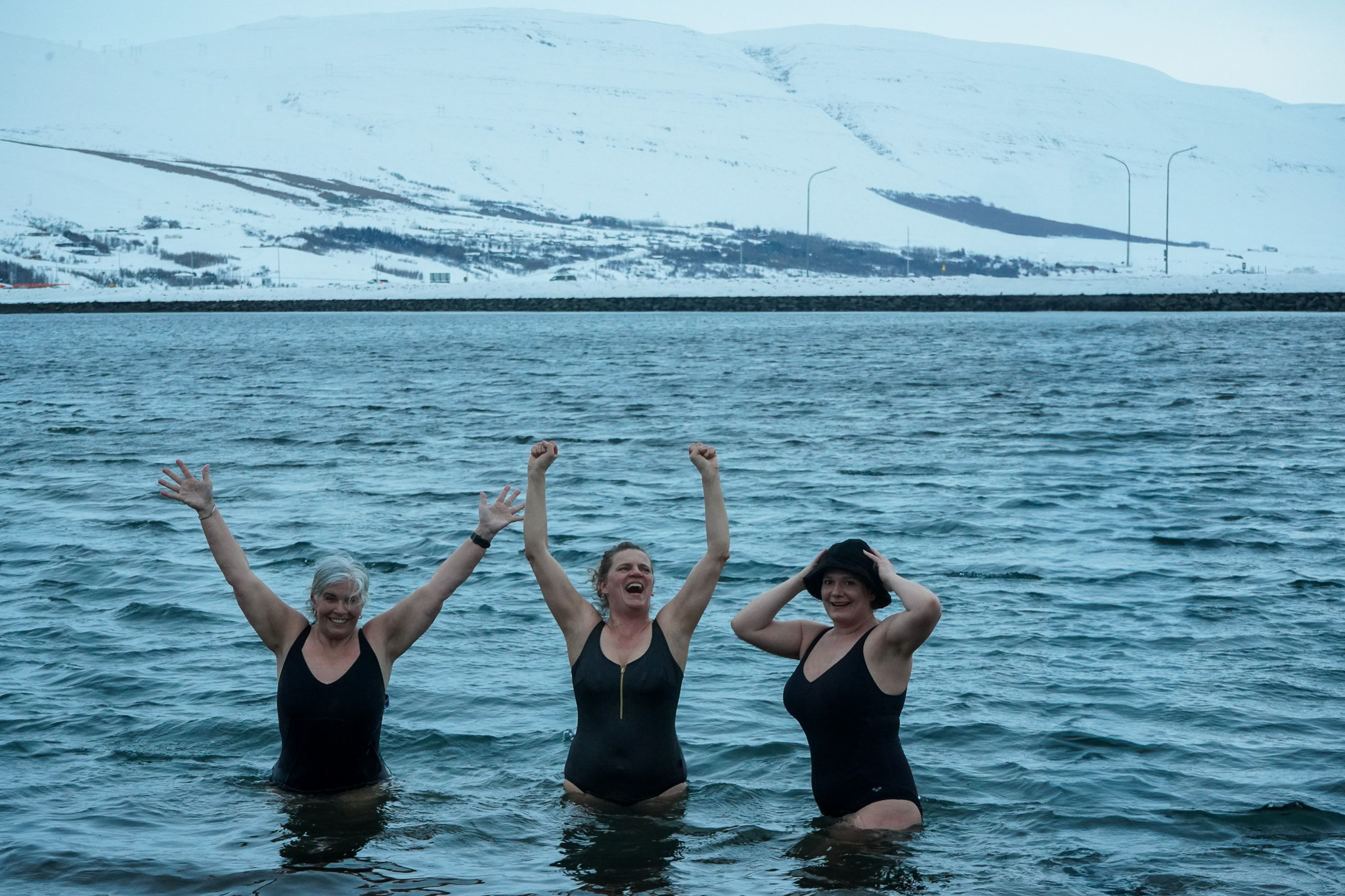 María Pálsdóttir opnaði Sánuvagn Mæju á árinu, og hefur boðið upp á sánugusur niðri við siglingarklúbbshús Nökkva við góðar undirtektir. Gestir vagnsins hafa oft kælt sig í sjónum á milli gusa, en hér er María með tveimur sánaskvísum í kælingu. Viðtal við Maríu: