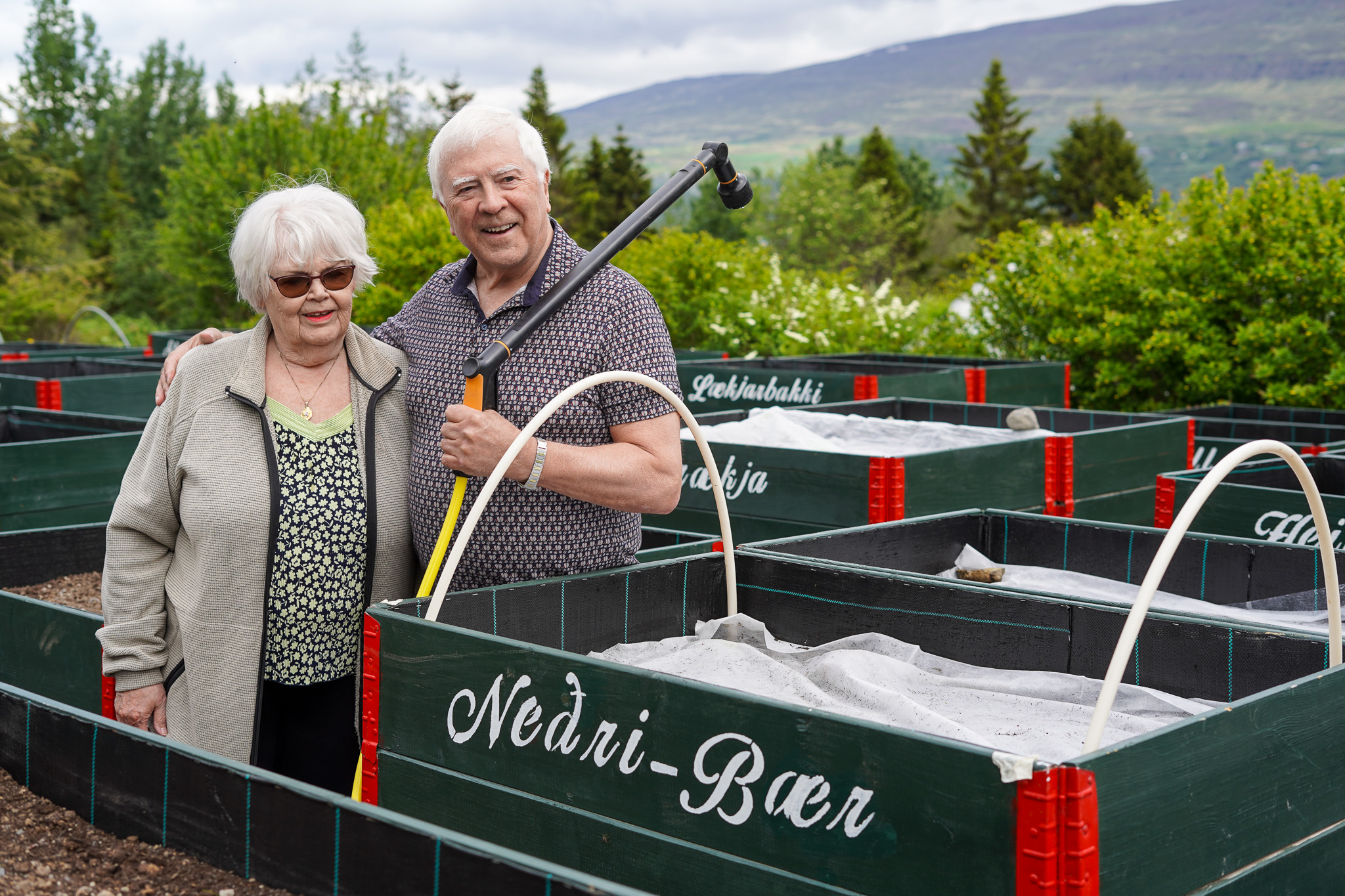 Róshildur Sigtryggsdóttir og Baldvin Bjarnason nýttu sér upphækkuð beð, sem eru nýjung hjá Matjurtargörðum Akureyrar. Þau fengu að skíra beðið sitt Neðri-Bæ, eftir fæðingarstað Baldvins á Flatey á Skjálfanda. Rætt var við þau og Heiðrúnu Sigurðardóttur garðyrkjufræðing hjá Matjurtagörðunum.