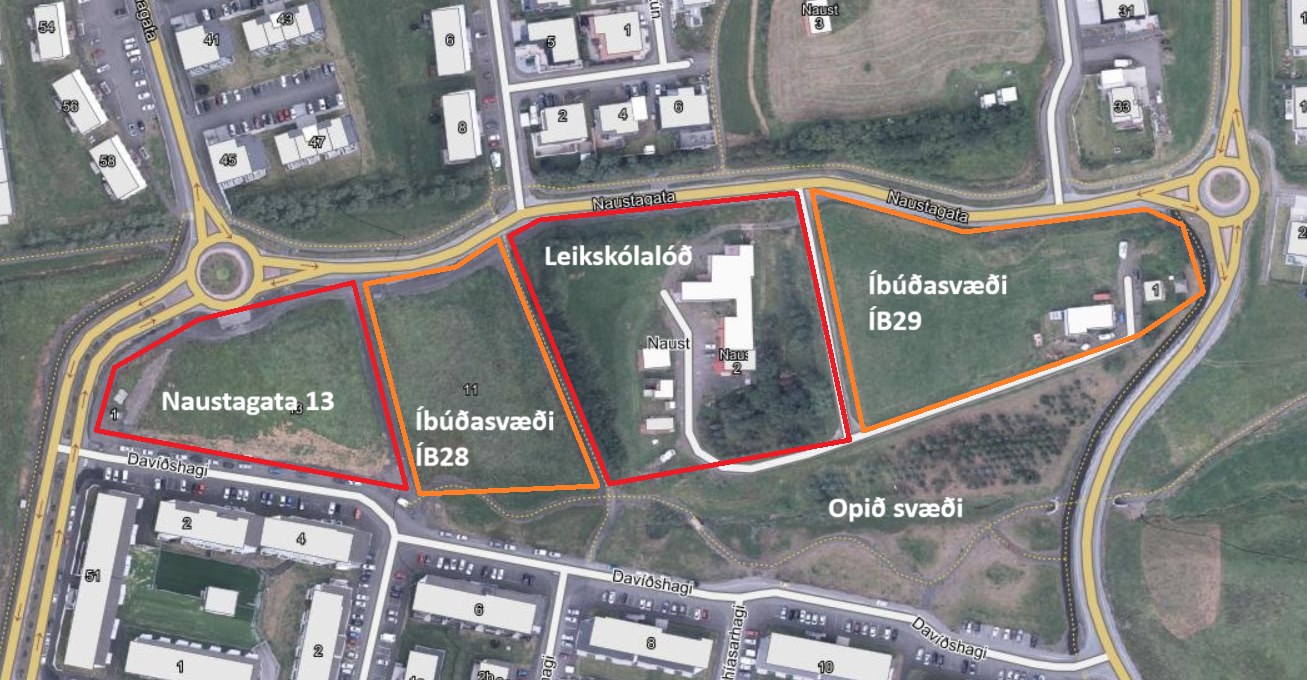 Áfram var hugað að uppbyggingu á lóðinni Naustagötu 13. Meirihluti skipulagsráðs samþykkti að kynna nýja tillögu að deiliskipulagi fyrir lóðina og jafnframt að kynnt verði drög að breytingu á aðalskipulagi til samræmis við ákvæði deiliskipulagsins. Áfram eru áform um að byggja þar tvö hús, annað fimm hæða og hitt tveggja hæða með bílakjallara. Í aðalskipulagi er gert ráð fyrir verslun og þjónustu á jarðhæð en íbúðum á efri hæðum.