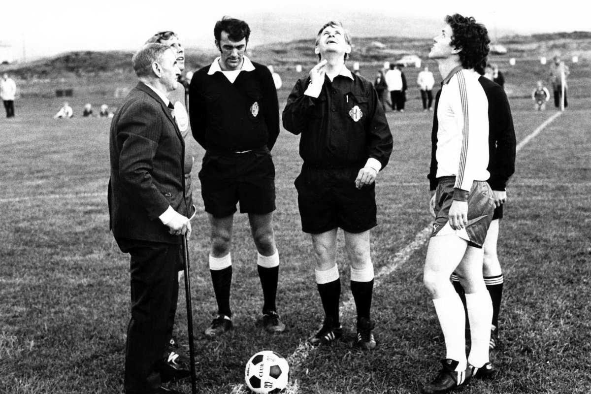 Meðal atriða á þessum mikla hátíðisdegi í september 1980 var leikur knattspyrnuliðs Þórs það ár og liðs Þórsara sem höfðu verið í eldlínunni 1970. Fyrstu spyrnuna tók Hallfreð Sigtryggsson, sem var einn stofnenda félagsins 65 árum fyrr. Hann er lengst til vinstri á myndinni, þá Magnús Jónatansson fyrirliði 1970-liðsins, Kjartan Tómasson línuvörður, Rafn Hjaltalín dómari, Árni Jakob Stefánsson fyrirliði Þórs 1980 og Þóroddur Hjaltalín línuvörður; aðeins sést glitta í Þórodd á bak við Árna.