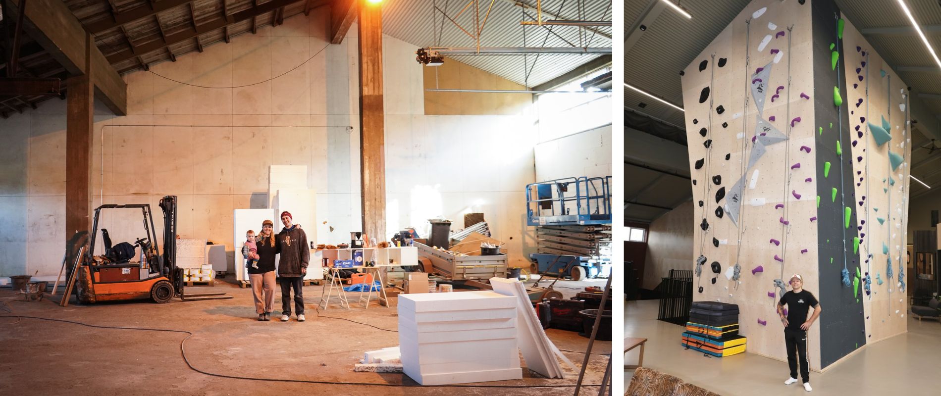 Mikið hefur gerst síðan í marsmánuði. Til vinstri eru Katrín og Magnús í húsnæðinu að Dalsbraut 1 í mars, en einmitt þar sem þau standa, er kominn stærðarinnar klifurveggur og gat ofan í gólfið niður á neðri hæðina. Klifurveggurinn sést einmitt þarna á myndinni til hægri, eins og hann er í dag. Myndir Rakel Hinriksdóttir / Þorgeir Baldursson