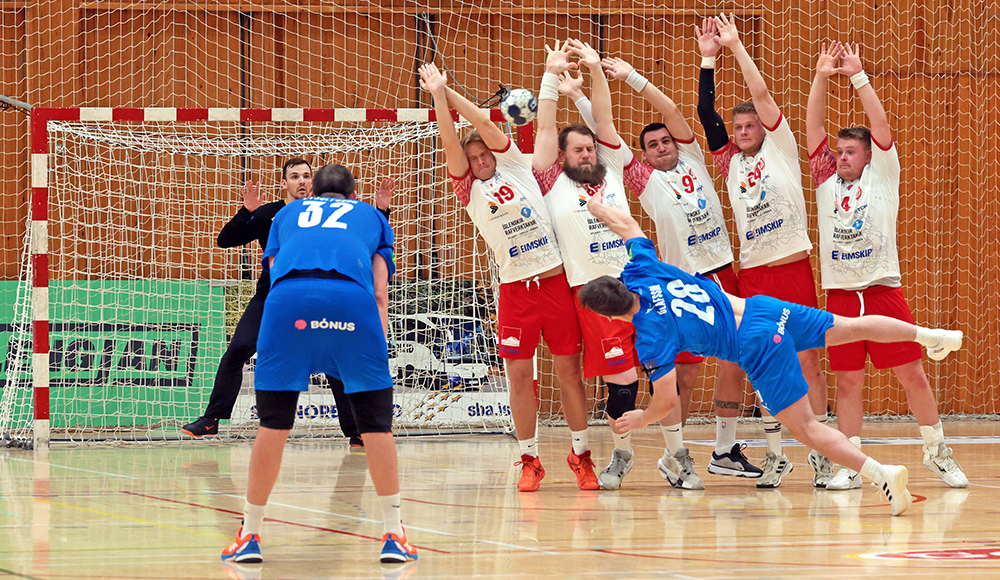 Lokaskotið; Hans Jörgen Ólafsson freistaði þess að tryggja Stjörnunni sigur með skoti úr aukakasti þegar ein sekúnda var eftir. Það tókst ekki, Hafþór Inga Halldórsson, lengst til vinstri í veggnum, varð skotið.