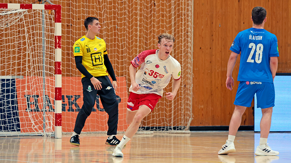 Hákon Ingi Halldórsson hleypur glaðir í bragði í vörnina eftir að hann kom Þór fjórum mörkum yfir – 31:27 – þegar 12 mínútur eftir. En þá tók við afar slæmur kafli hjá Þór; Stjarnan gerði sex mörk í röð á tæpum níu mínútum.
