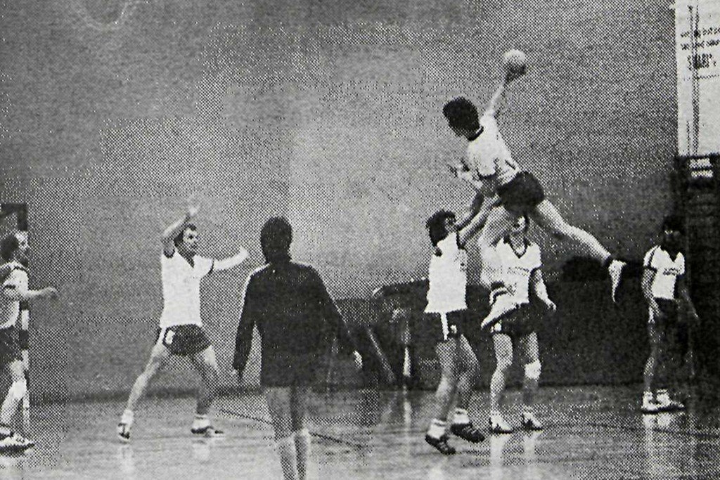 Þarna eigast við KA og Þór í íþróttaskemmunni á Oddeyri áður en Alfreð hélt á vit ævintýranna erlendis, og segja má að myndin sé táknræn að því leyti að hann hefur oft borið höfuð og herðar yfir andstæðinga sína í gegnum tíðina.