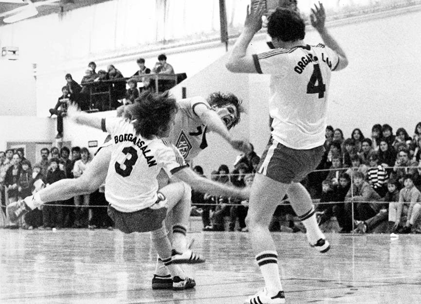 Alfreð var einmitt þekktur fyrir sín þrumuskot á árum áður og meðfylgjandi mynd er því vel hæfi sem sú gamla að þessu sinni. Hann hrellti andstæðingana fyrst með KA, síðan KR, Tusem Essen í Þýskalandi, spænska liðinu Elgorriaga Bidasoa og loks KA á ný, eftir að hann sneri aftur heim árið 1991. Alfreð lék þá með KA í nokkur en hóf jafnframt þjálfaraferilinn, einn þann glæsilegasta sem sögur fara af. Myndin er tekin í „gömlu, góðu“ íþróttaskemmunni – Skemmunni – á Oddeyri í leik KA og Þórs seint á áttunda áratug síðustu aldrei. Alfreð hefur þarna hleypt af og telja verður meiri líkur en minni á því að boltinn sé á leið í netmösvkana á því augnabliki sem ljósmyndarinn smellti af. Þórsararnir eru Gunnar Malmquist Gunnarsson, til vinstri, og Arnar Guðlaugsson.