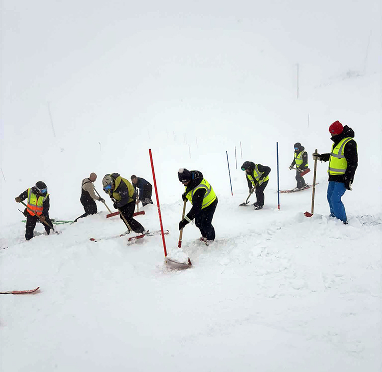 Vaskir sjálfboðaliðar að störfum í brautinni á milli ferða í svigkeppninni á mánudag.