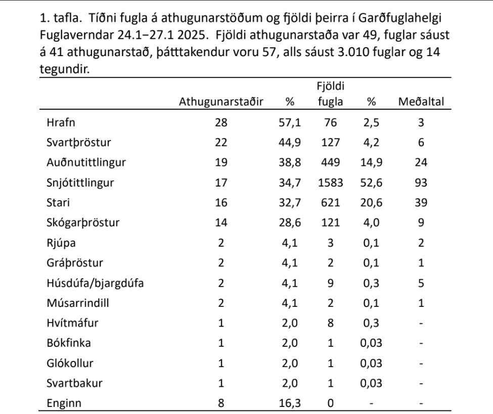 Árið 2025 voru þátttakendur alls 57 og alls töldu þeir ríflega 3.000 fugla af 14 tegundur. Nánari niðurstöður má sjá í meðfylgjandi töflu.