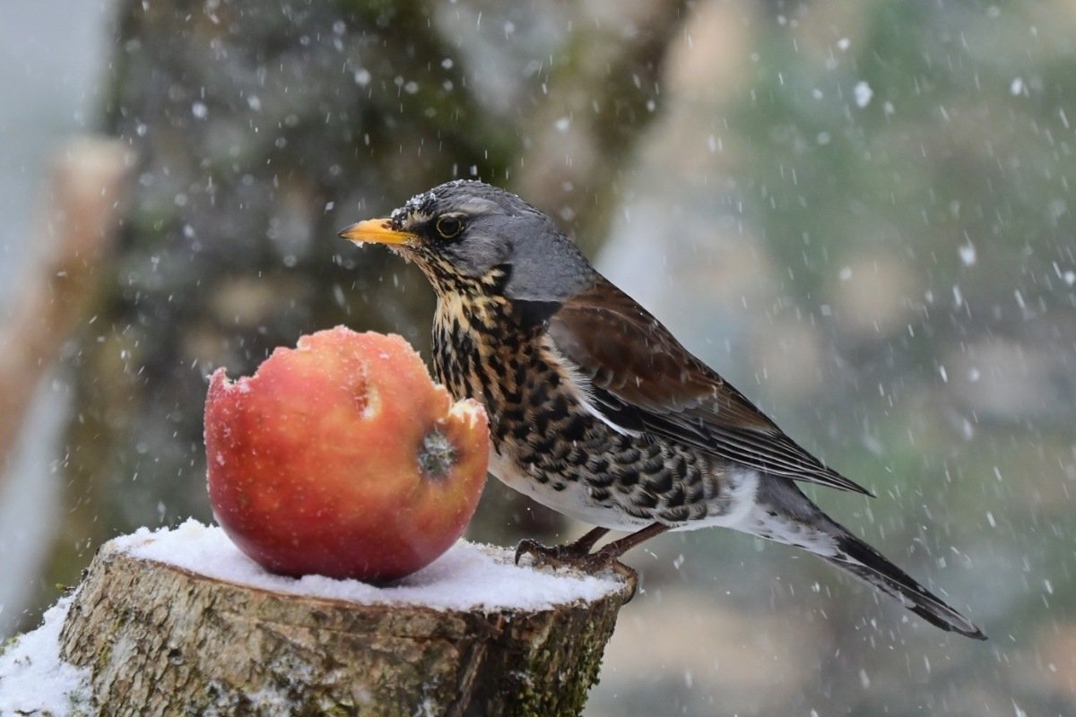 Gráþröstur með epli. Mynd: Fuglavernd.