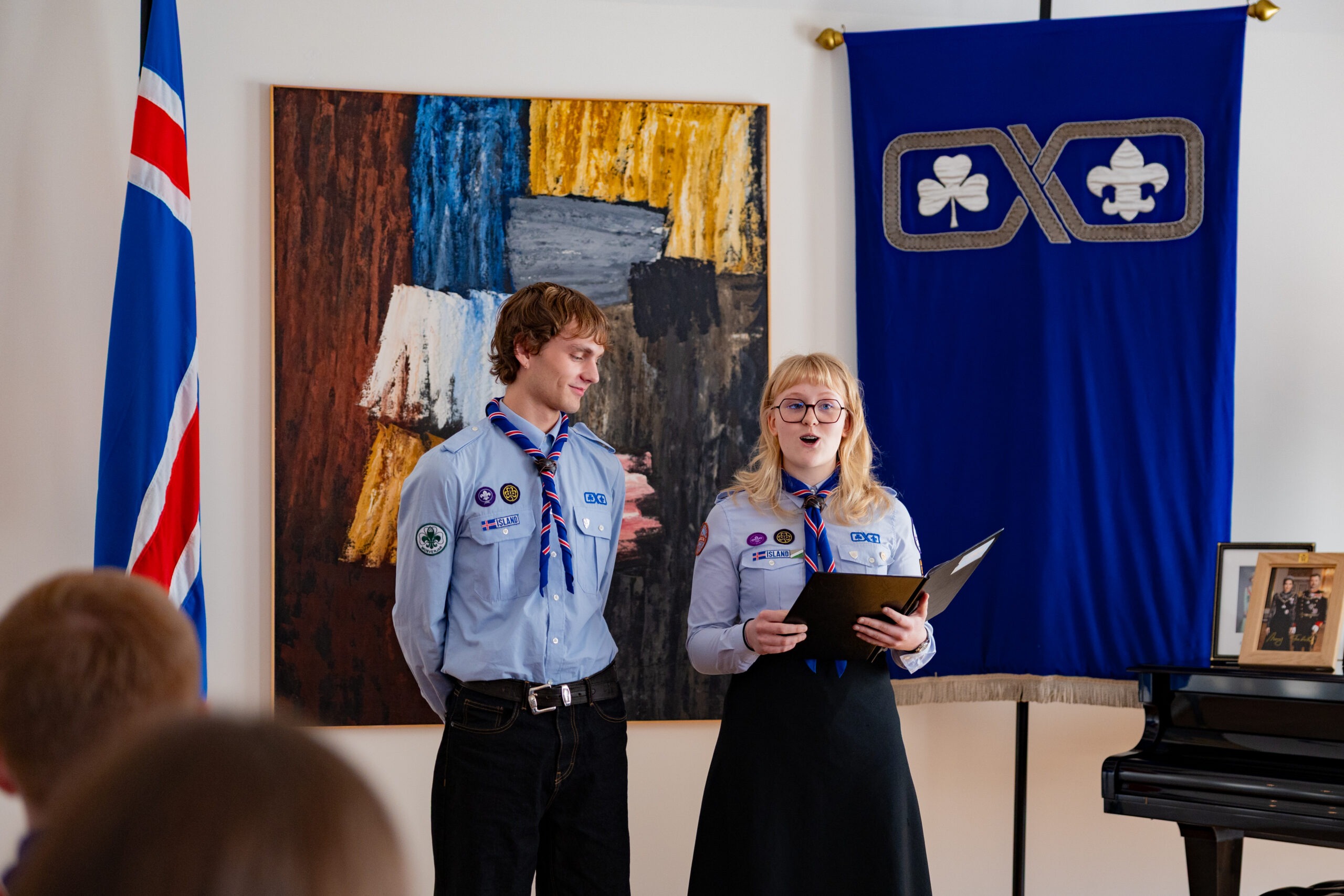 Tvö úr hópi þeirra skáta sem hlutu forsetamerkið að þessu sinni fluttu ávörp við athöfnina á Bessastöðum. Fríða Björg Tómasdóttir, Skátafélaginu Klakki, og Kristófer Njálsson, Skátafélaginu Mosverjum. Mynd: Bandalag íslenskra skáta.