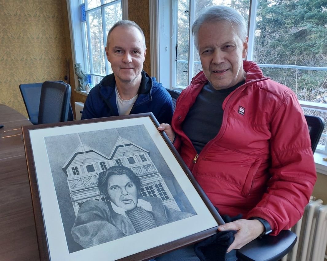 Um er að ræða blýantsteikningu sem Guðmundur Oddur gerði af Birni 1976, árið sem Björn útskrifaðist frá MA. Í bakgrunni er óþekkt timburhús sem svipar til Gamla skóla. Neðst á myndinni til hægri er áritunin „Guðmundur Oddur´76“. Kunnum við Birni hinar bestu þakkir fyrir höfðinglega gjöf. Hún mun sóma sér vel með verkum annarra listamanna í stóru safni skólans.