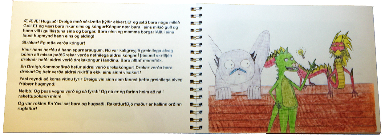 Hálft annað ár er síðan litli frændi kom í heiminn þannig að gerð bókarinnar hefur tekið drjúgan tíma en Bjarki haft mjög gaman af. „Dreigó er fyrsti dreki allra í sögubókum til að taka við konungsríki án þess að stela því. Hann vinnur það,“ segir hann og bætir við: „Það er svolítið grillaður húmor í þessu. Ég er gríðarlega ánægður með bókina og hún er fyrir alla, bæði foreldra og krakka.“