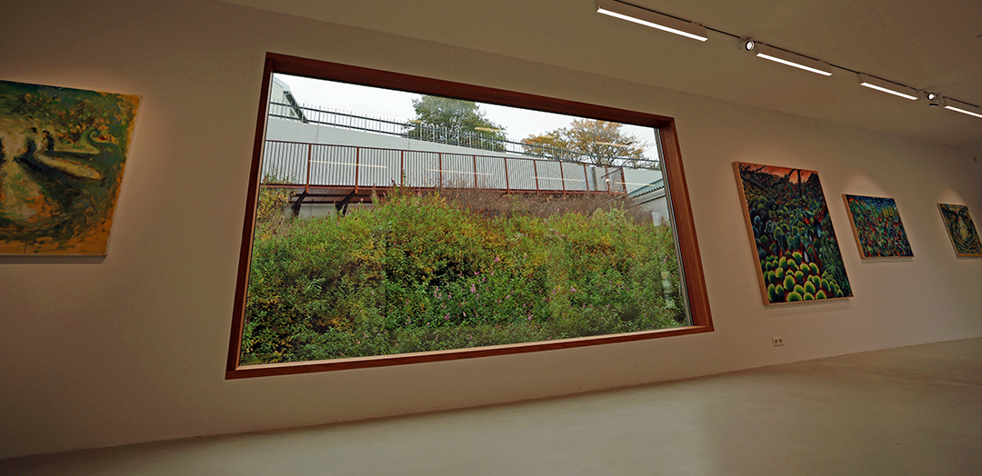 Breytilegt „listaverk“ blasir við þegar horft er út um glugga tengigangs milli Listasafnsins og Ketilhússins, í átt að Gilsbakkavegi.