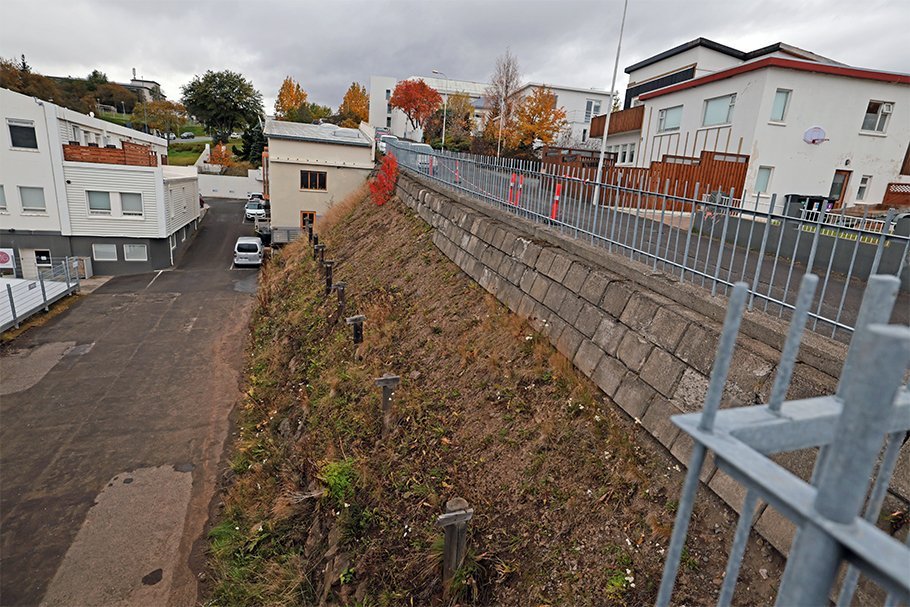Til stendur að laga vegginn og setja nýja kanthleðslu og tryggja þar með brekkuna. Fyrir nokkrum árum var farið í sambærilegar framkvæmdir neðar í götunni, ofan Ketilhússins, og Dóra Sif segir að þær framkvæmdir hafi staðist vel.