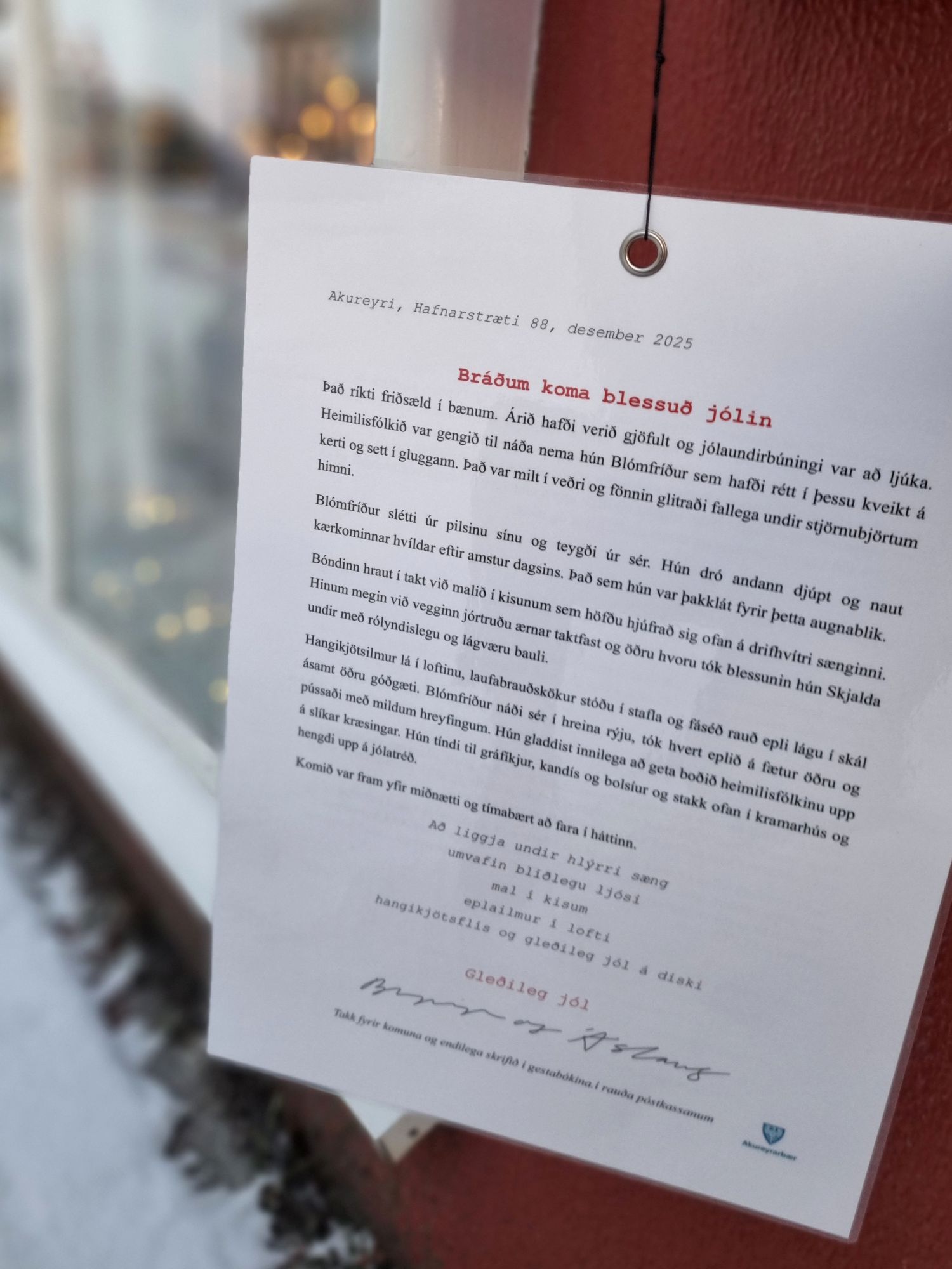 Glugginn í Hafnarstræti 88 er hugverk systranna Brynju Harðardóttur Tveiten myndlistarkonu og Áslaugar Harðardóttur Tveiten sem rekur skrautmunasöluna Fröken Blómfríður. „Glugginn tengist líðandi stundu hverju sinni og er tilvalinn áfangastaður í gönguferðum og vettvangsferðum. Hann hefur þann tilgang að lífga upp á umhverfið, hvetja vegfarendur til að staldra við í amstri dagsins og skapa gleði, hlýju og nánd,“ segir í tilkynningu.