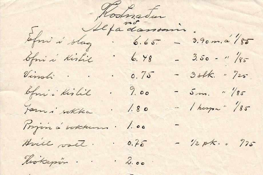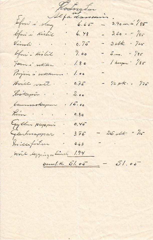 Blaðið er óárssett en meðliggjandi skjöl eru frá árunum 1939-1941 svo leiða má líkum að því að þetta blað sé frá svipuðum tíma. Allt bendir til að hér um að ræða efniskostnað í búninga þeirra sem léku álfa og huldufólk á álfadansinum.
