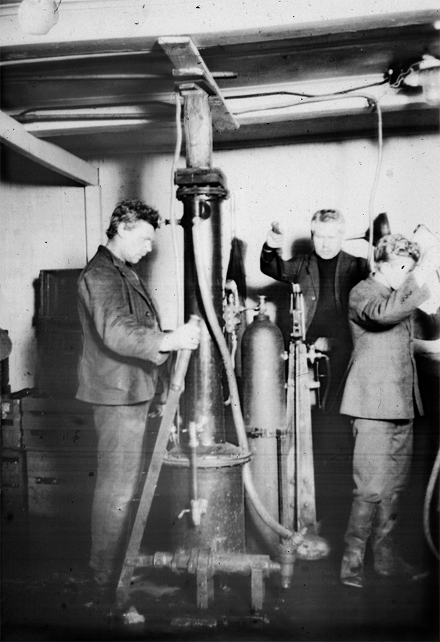 Úr gosdrykkjaverksmiðju Eggerts límonaði. Eggert sjálfur er á miðri myndinni, hægra megin er sonur hans, Vernharður Eggertsson, síðar sjómaður og rithöfundur sem gekk undir skáldanafninu Dagur Austan. Maðurinn til vinstri er óþekktur. Ljósmynd: Iðnaðarmannafélag Akureyrar/Minjasafnið á Akureyri