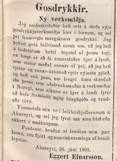 Eggert tilkynnir að hann hafi sett á stofn gosdrykkjaverksmiðju. Hún átti eftir að verða leiðandi í öl- og gosdrykkjagerð á Akureyri næstu áratugina. Stefnir 9: 14 (1901): bls. 55.