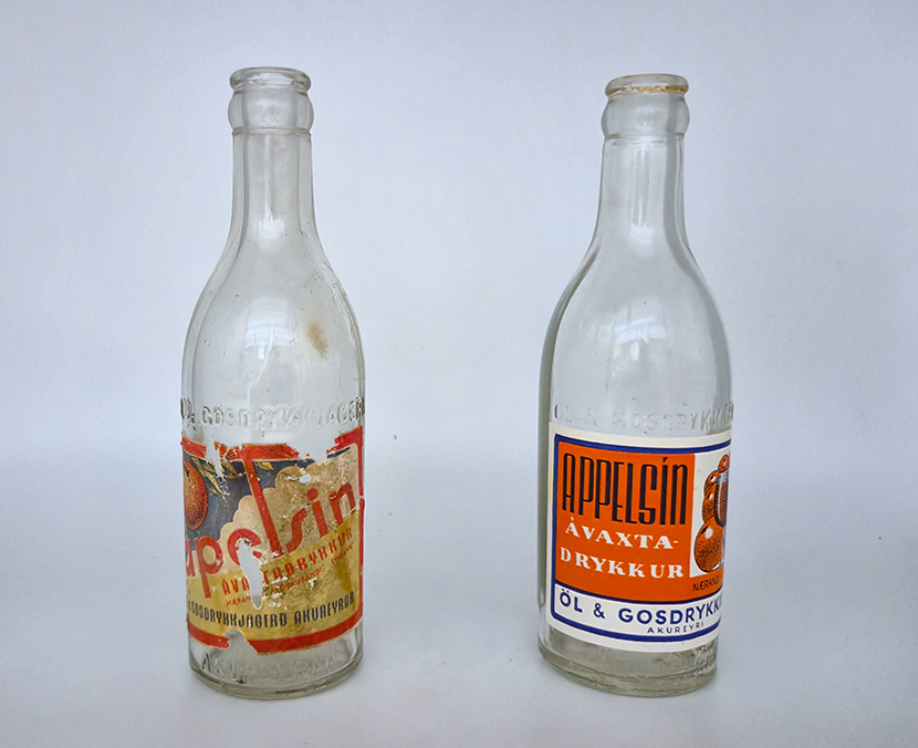 Tvær flöskur með appelsíni. Sú til vinstri er úr tíð Eggerts en flaskan hægra megin er með miða merktum „Öl og gosdrykkir h.f.“. Það nafn kom til eftir lát Eggerts þegar gosdrykkjaverksmiðjunni var breytt í hlutafélag með nýjum forstjóra. Báðar flöskurnar eru þó merktar með upphleyptu letri „Öl- og gosdrykkjagerð Akureyrar“, enda voru flöskurnar nýttar áfram.