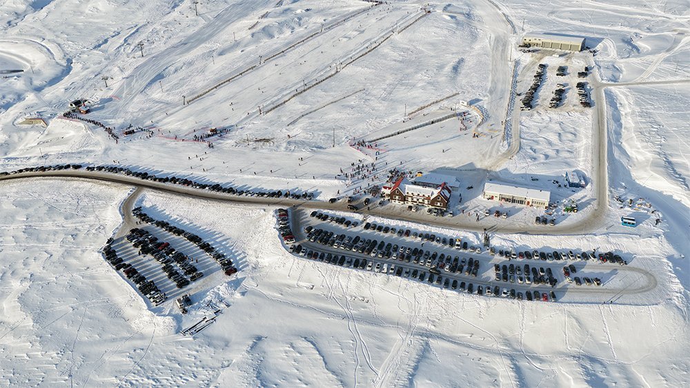 Bílafjöld var á stæðunum í Hlíðarfjalli í morgun þegar Þorgeir Baldursson sendi drónann á loft og tók þessa mynd.
