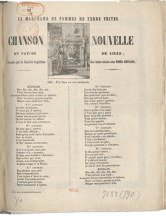 Í iðnaðarborginni Lille var hún steikt sem ódýr götumatur og árið 1852 birtist lag með titlinum Le marchand de pommes de terre frites, sem lýsir sölumanni steiktra kartaflna. Lille er í norðurhluta Frakklands, liggur á mörkum Frakklands og Vallóníu, frönskumælandi hluta Belgíu. Þar blönduðust frönsk og vallónsk matarhefð og þar virðist götusala á pommes frites hafa fyrst hafist fyrir alvöru. Á þessum landamærum runnu saman frönsk steikingartækni og vallónsk heimilismatargerð – og þar varð til sú menningarlega samsuða sem átti eftir að fæða af sér frönsku kartöfluna í nútímabúningi.
