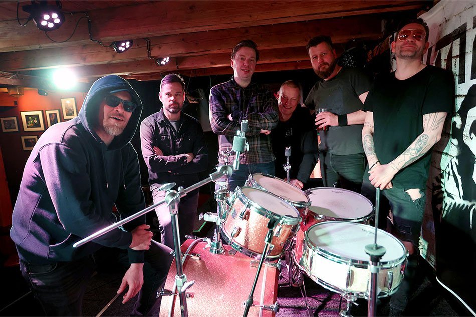 Toy Machine að loknum útgáfu- og „lokatónleikum“ hljómsveitarinnar á Græna Hattinum 2022. Frá vinstri: Jens Ólafsson, Kristján Örnólfsson, Baldvin Zophoníasson, Gunnar Sigurbjörnsson hljóðmaður – „sjötti Bítillinn“ – Atli Hergeirsson og Árni Elliott. Hún mun þrátt fyrir „lokatónleika“ 2022 stíga á svið á Eyrarrokki. Mynd: Skapti Hallgrímsson.