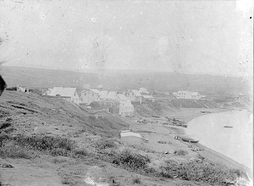 • Húsaþyrpingin í forgrunni eru KÞ húsin og stóru húsin hægra megin eru sennilega Guðjonhsen húsin, verslun-vöruhús-heimili.