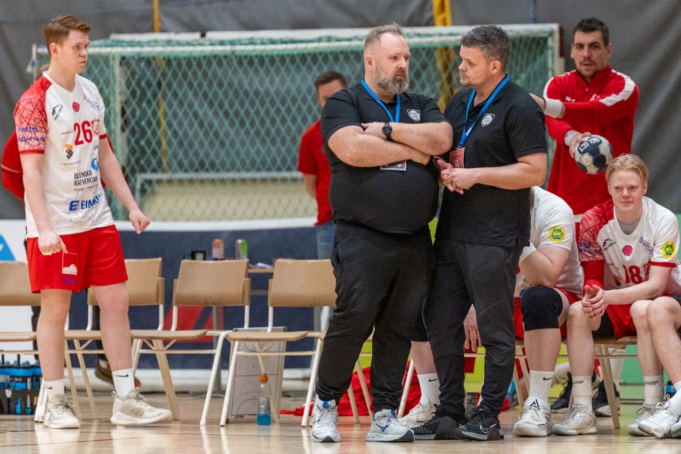 Daniel Birkelund þjálfari Þórs og Gunnar Líndal Sigurðsson aðstoðarþjálfari liðsins ræða saman í Höllinni í dag. Lengst til vinstri er Sigurður Ringsted Sigurðsson, til hægri situr Þormar Sigurðsson og Igor Chiseliov stendur fyrir aftan varamannabekkinn.