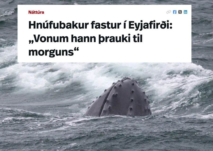 Nánar á vef RÚV, þar sem sjá má myndband af hvalnum. Smellið á myndina hér að neðan til að sjá fréttina.