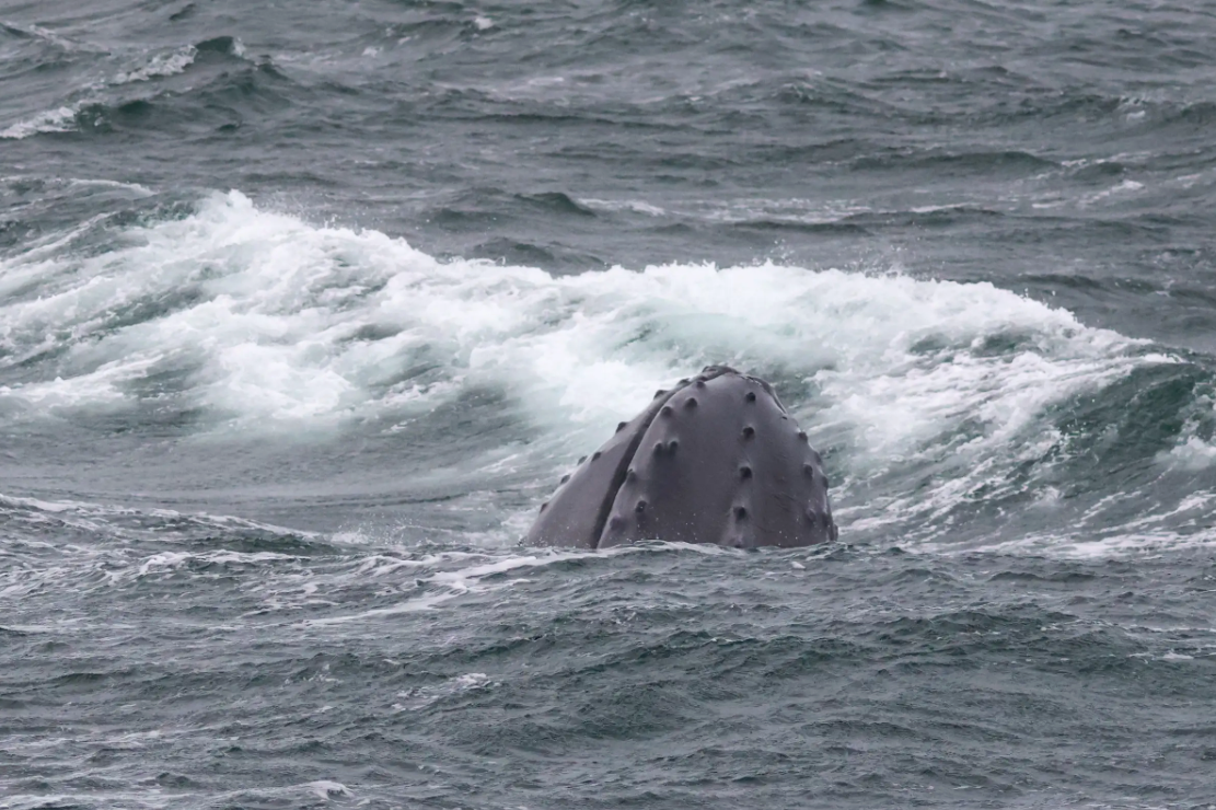 Sporður hnúfubaksins eða afturhluti hans virðist flæktur, því hann nær að stinga upp höfðinu. Ekki er þó ljóst hvað heldur honum þarna föstum. Mynd af vef RÚV: Freyr Antonsson