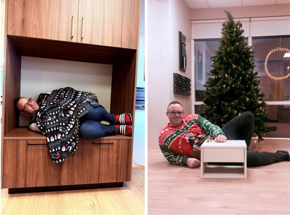Húsheild Hyrna er með Instagram reikninginn hh_innrettingar_gluggar þar sem oft er slegið á létta strengi. Eiríkur sölu-og framleiðslustjóri var t.d. með skemmtilegt jóladagatal þar inni fyrir jólin. Takið eftir náttborðinu á myndinni til hægri, það er stöðluð vara hjá fyrirtækinu en það er unnið úr afgangsefni sem til fellur við aðra framleiðslu.