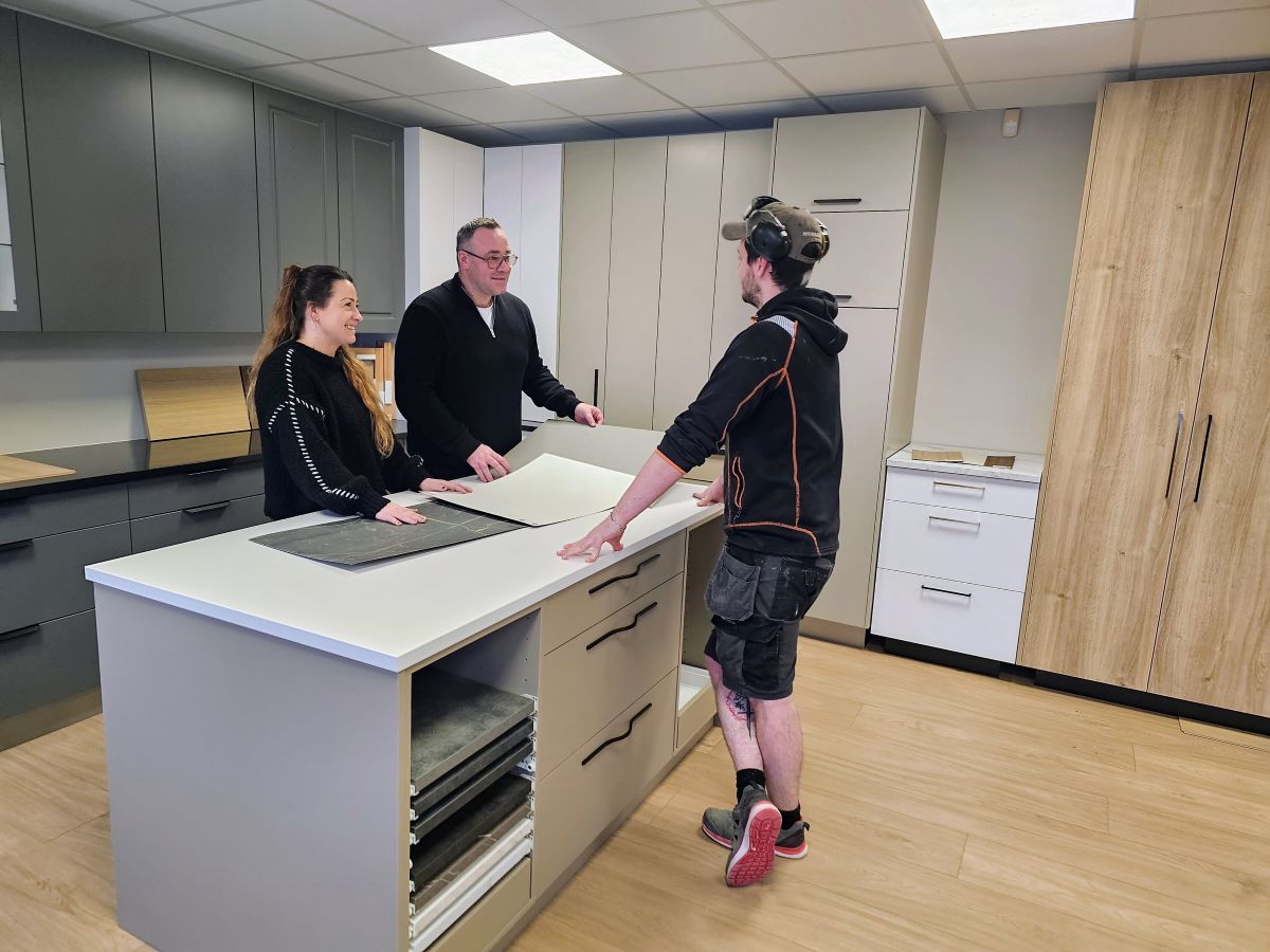 Hyrna standard er byggð á tímalausum grunni með fjórum stöðluðum litum á framhliðum. Þá leysir fyrirtækið einnig sérpantanir sé þess óskað. Hér leggur Eiríkur á ráðin með Evu Tryggvadóttur, innanhússhönnuði og smiðnum Ísaki Elí Marinóssyni. Mynd:SNÆ