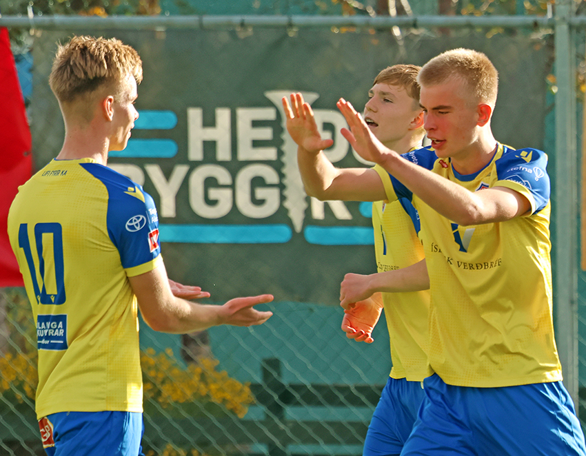 Markinu fagnað! Valdimar Logi Sævarsson, sem skaut í slá úr aukaspyrnunni, er til vinstri.