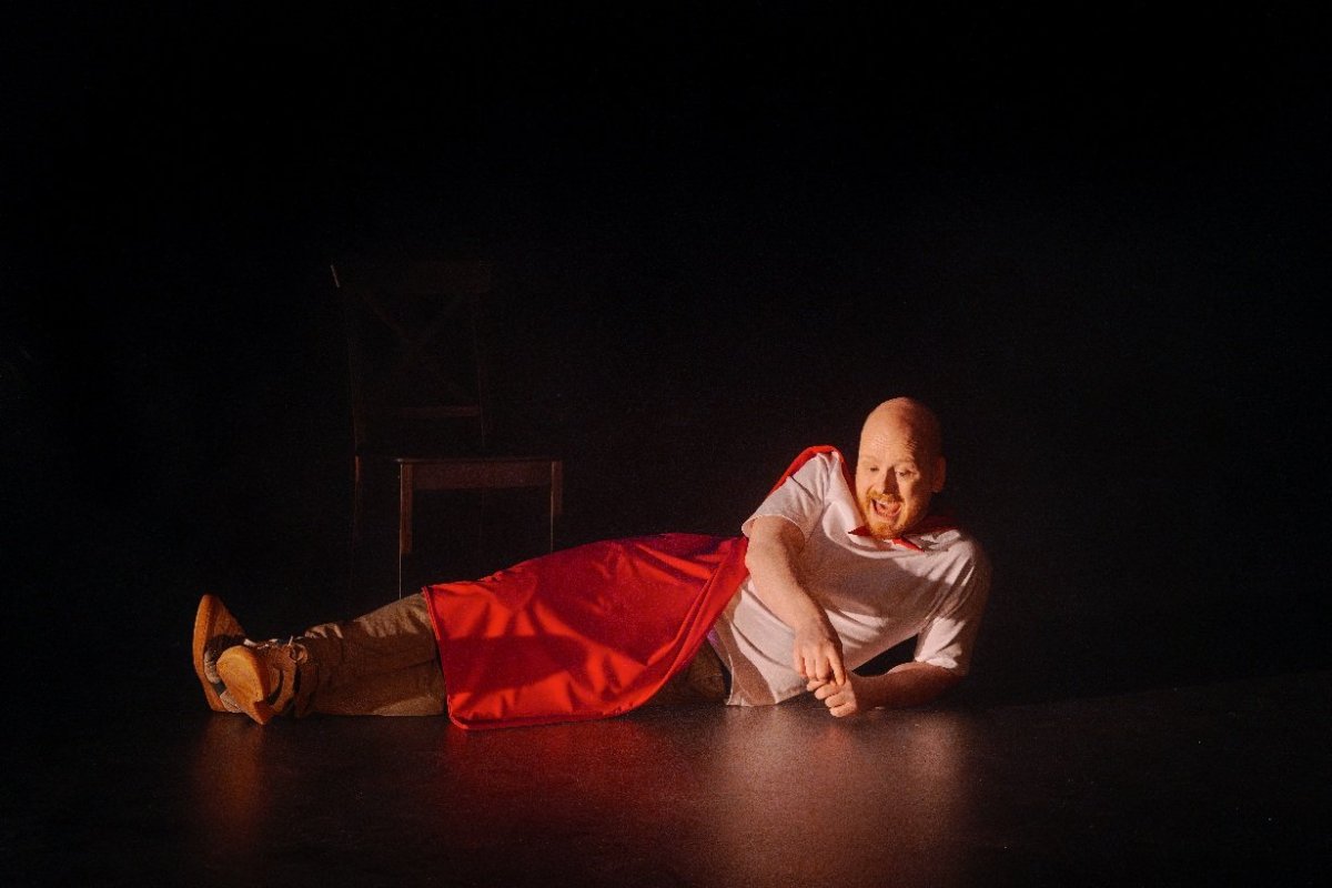 Fmmtán hlutverk á 80 mínútum. Ævar Þór stendur einn á senunni í Kafteinn Frábær. Tvær sýningar verða á Akureyri um miðjan janúar. Mynd: Björgvin Sigurðarson