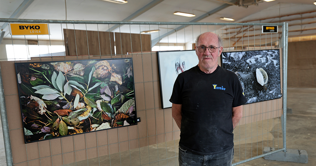 Þengill Valdimarsson við eigin ljósmyndir sem búið er að hengja upp á Ýmishúsinu.